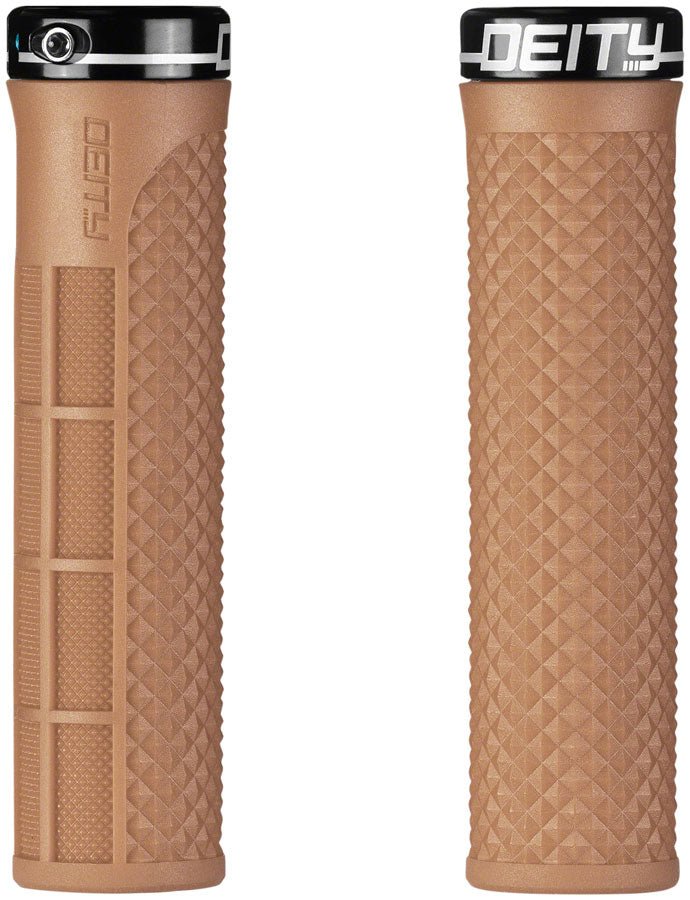 DEITY Lockjaw Grips - Gum Lock-On. Overwhelming demand for a diamond version of the Deity Knuckleduster lead us to the phenomenal feel of the Lockjaw.. With sweeping transitions from the padded thumb area to the deep dish diamond top pattern to a recessed half waffle the Lockjaw delivers a technically precise feel from end to end. Utilizing TRC+ rubber compound allows us to maintain industry leading durability but delivered in a soft plush and sticky durometer. By combining our tapered inner sleeve and single lock ring system coupled with our new extra grippy rubber and recessed half waffle the Lockjaw gives you an extremely responsive feeling cockpitPadded thumb area for comfort and smooth transitions