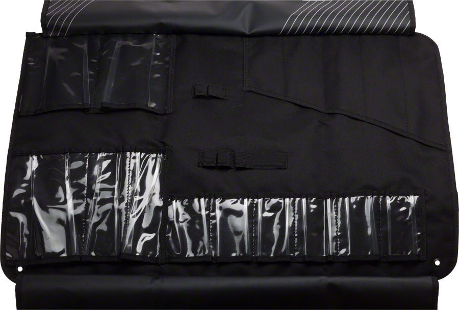 Wolf Tooth Travel Tool Wrap Black. The Tool Wrap was designed to make trailside repairs quick and efficient. Featuring multiple flaps that allow you hang it from a wall act as a changing area foot pad and more the Tool Wrap is the perfect trailhead companion.
